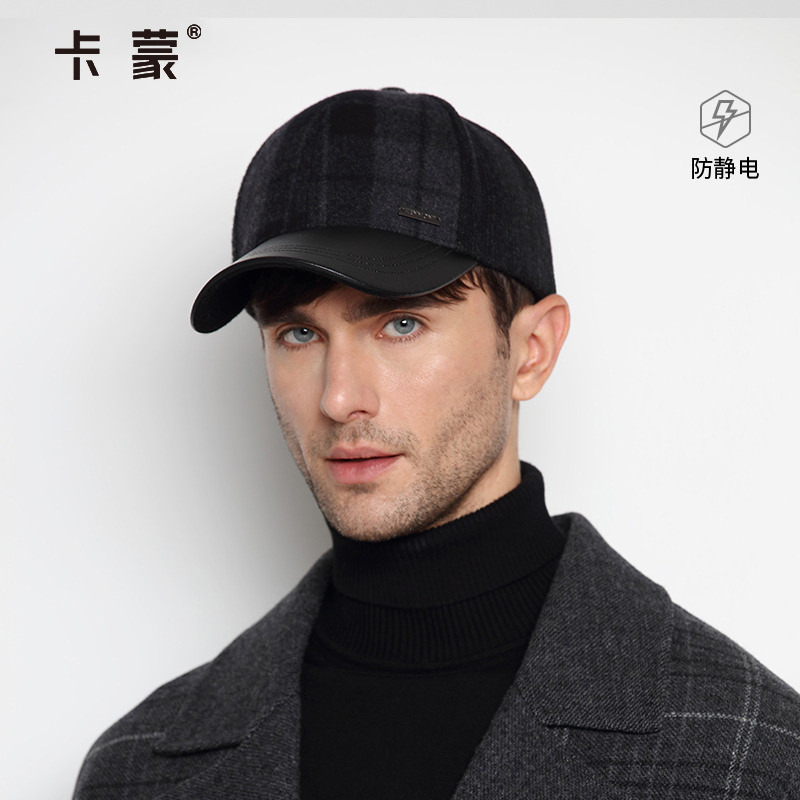 卡蒙真皮毛呢棒球帽男士秋冬季高档防静电山羊皮鸭舌帽百搭礼盒装