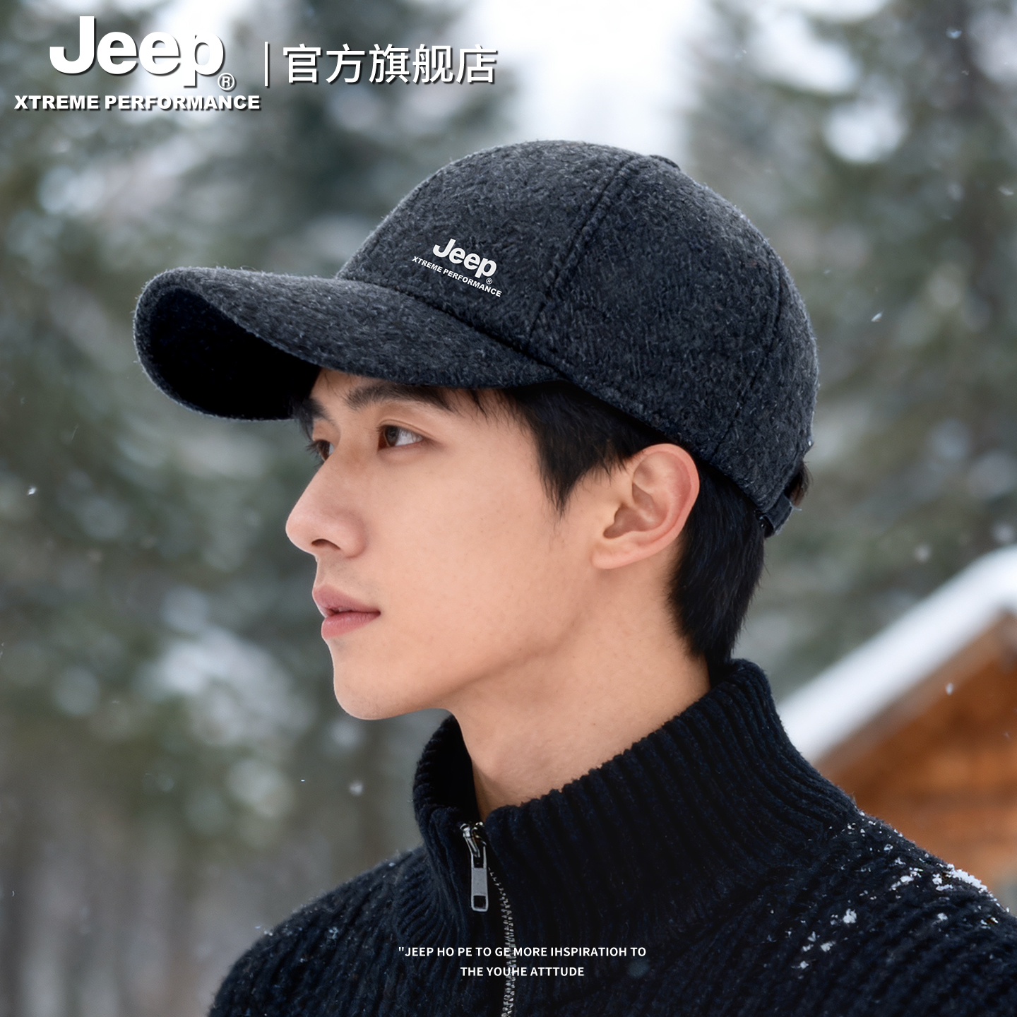 jeep吉普羊毛棒球帽男士冬季保暖户外骑行电动车防风鸭舌帽子男冬