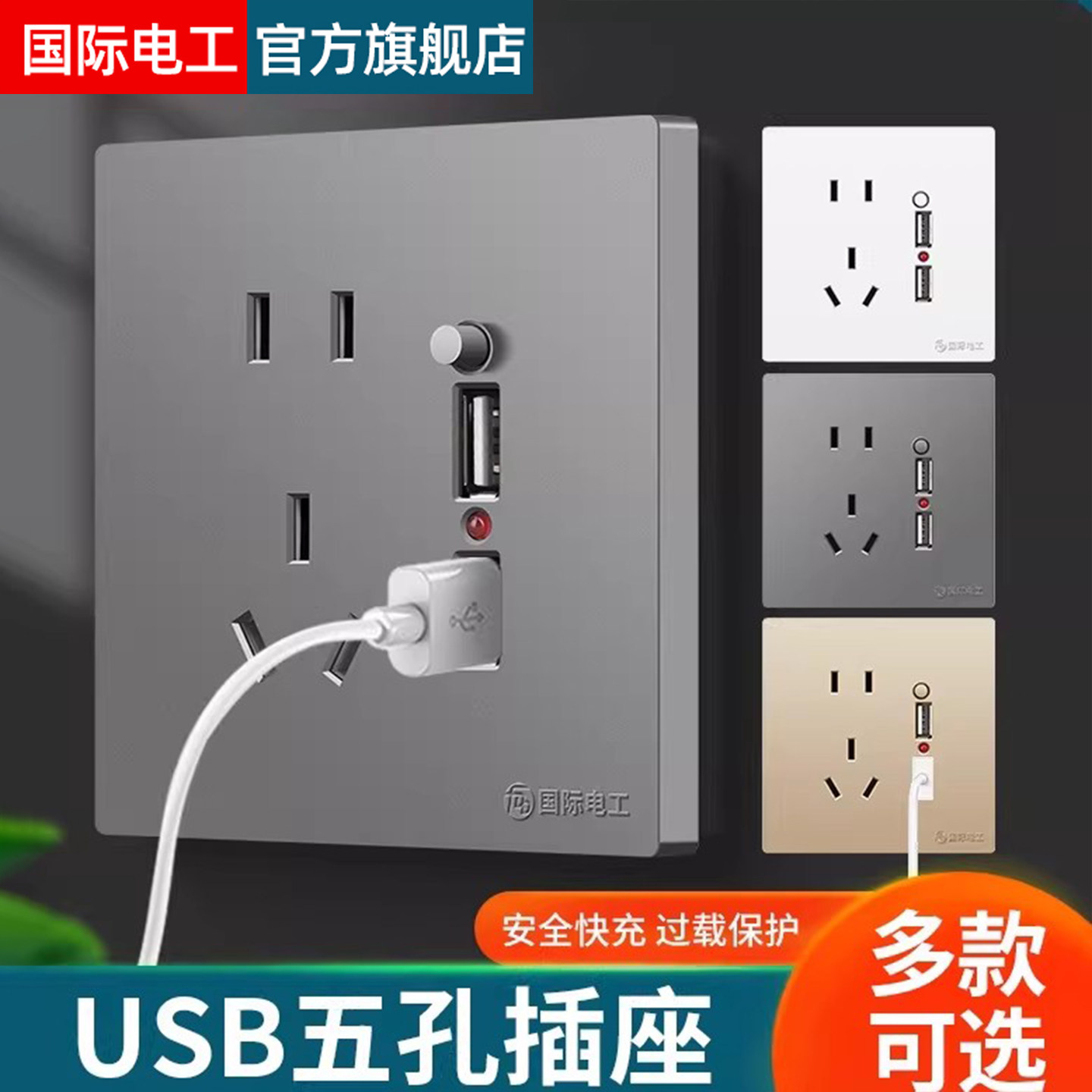 国际电工86型usb插座面板五孔带快充手机充电家用暗装墙壁数据线