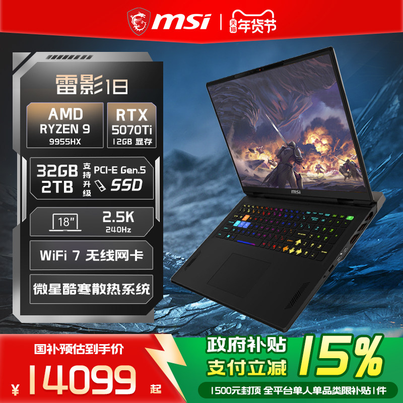 【直降补贴+国补15%】MSI/微星雷影18锐龙R9-9955HX笔记本电脑 RTX5070Ti显卡18英寸2.5K240Hz大屏游戏本官方