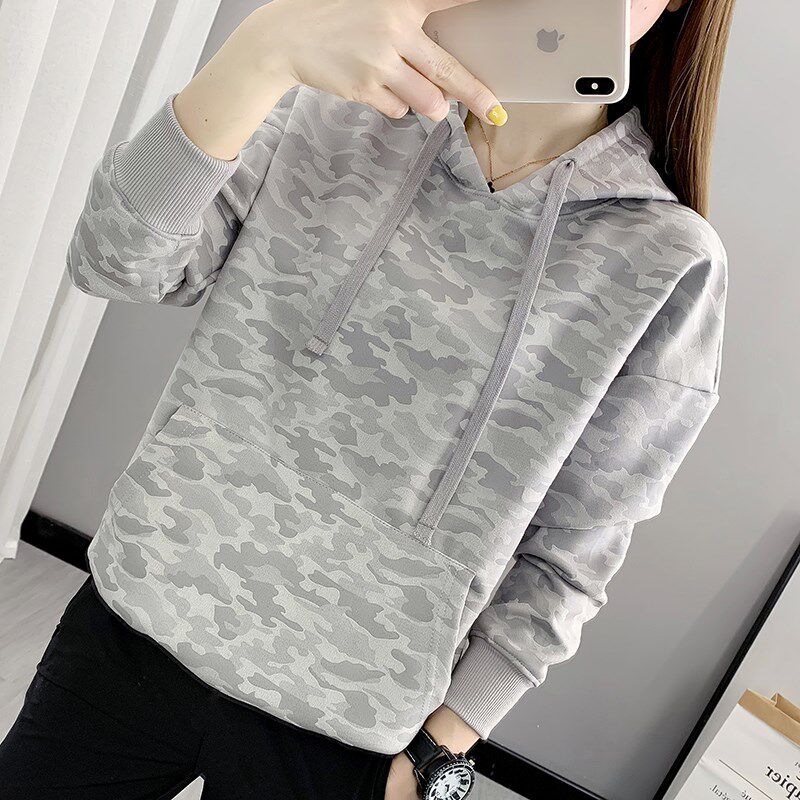 外贸连帽毛圈迷彩卫衣 春季新款长袖套头宽松女大码外套上衣21532