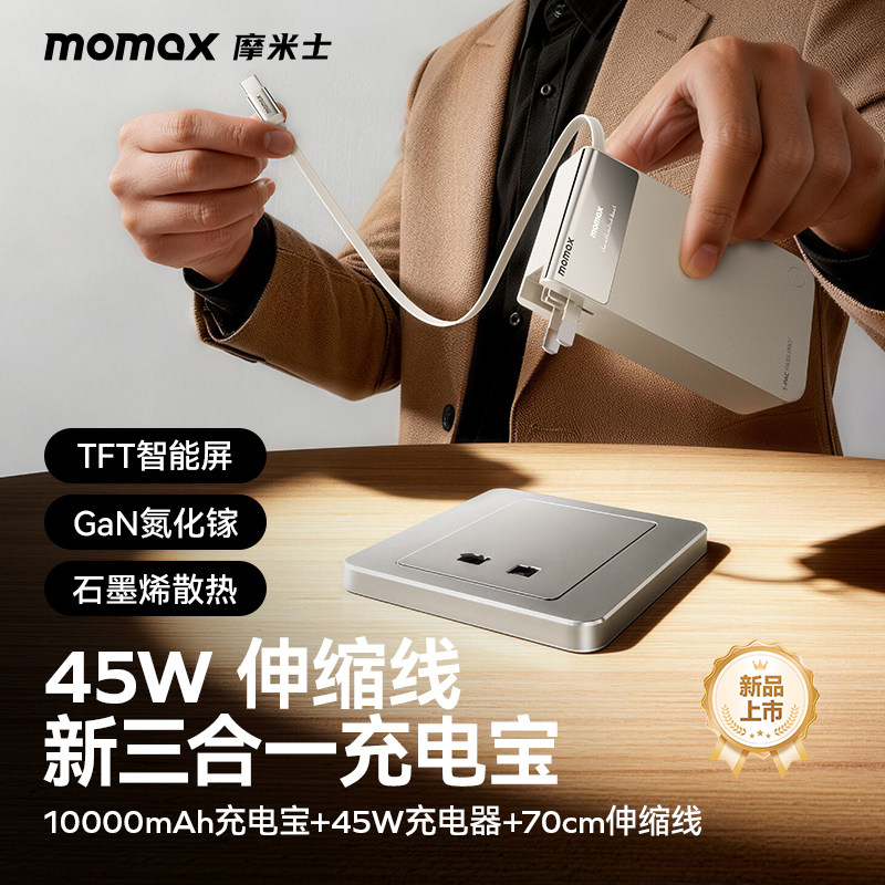 【3C认证可上飞机】MOMAX摩米士2026新款三合一充电宝自带伸缩线10000毫安45W快充带插头适用笔记本苹果17Pro