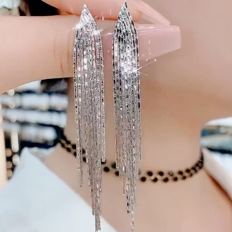 超闪锆石长款金属流苏夸张耳环高级感轻奢小众设计气质耳饰纯银针