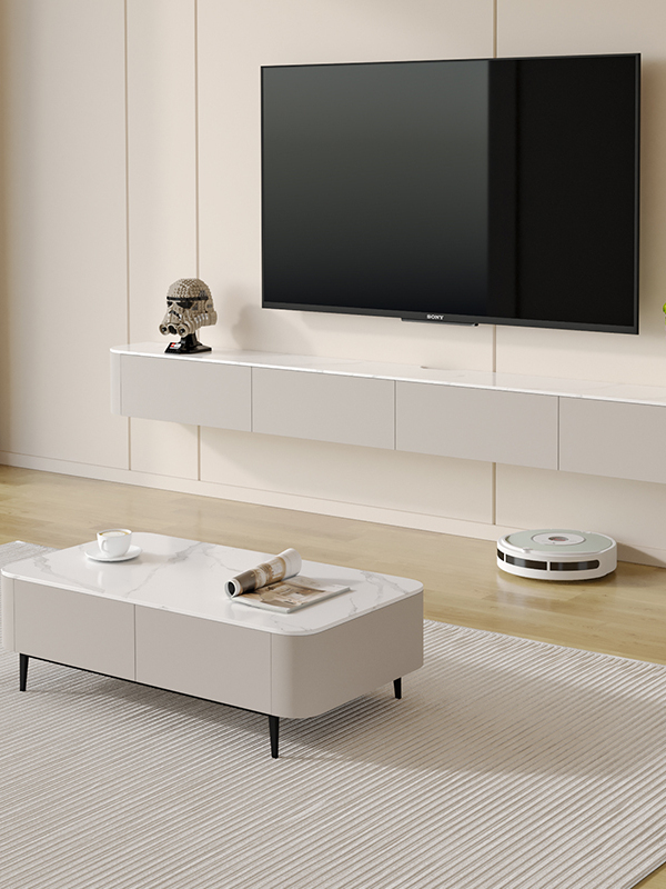 石板悬挂电视柜咖啡桌组合简单现代客厅小公寓奶油风格白色壁挂式