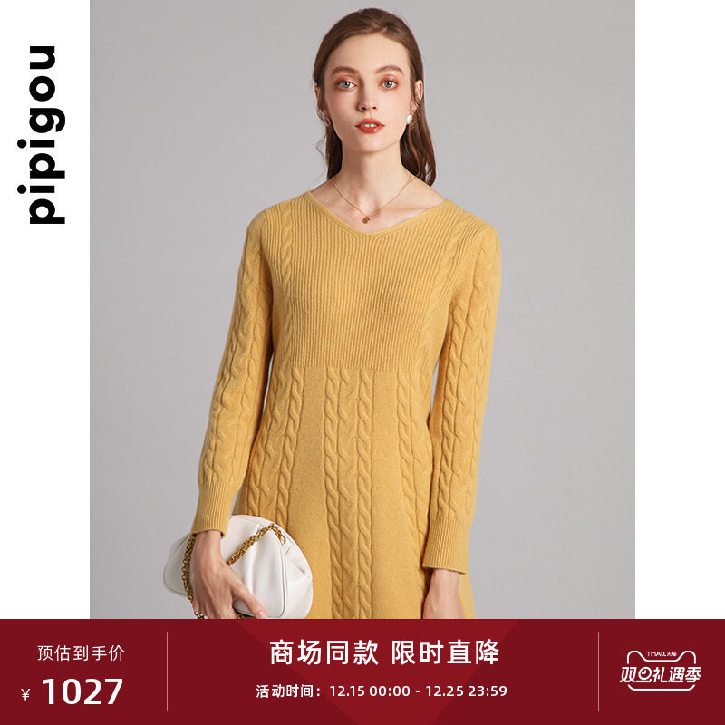 羊绒裙扭纹修身针织裙V领羊绒连衣裙女山羊绒衫中长款针织毛衣冬