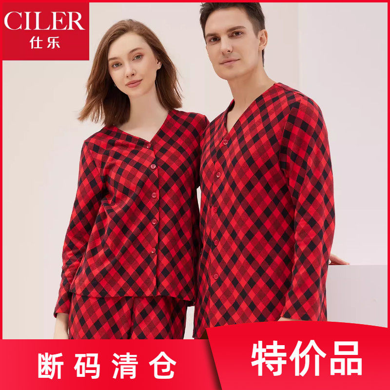 仕乐男士家居套装提花格子睡衣女春秋家居服可外穿红色本命年马年
