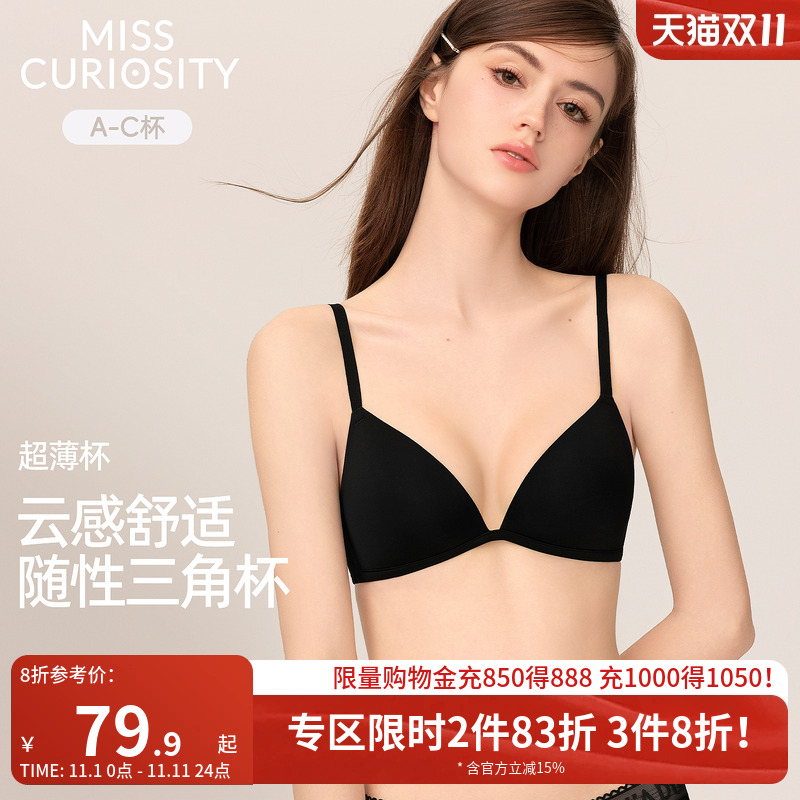 好奇蜜斯无痕内衣女法式三角杯夏超薄无钢圈大胸显小黑文胸罩套装