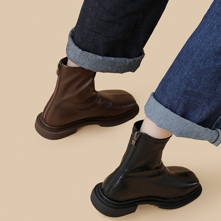 2025秋冬新款韩版圆头后拉链短靴女真皮平底低跟马丁靴百搭瘦瘦靴