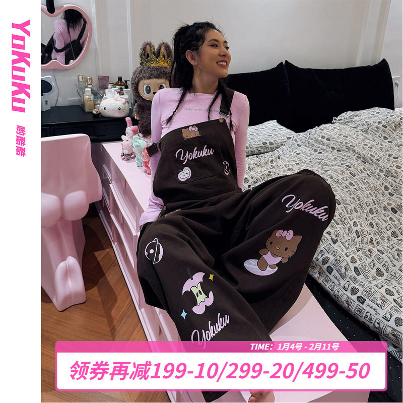 哟酷酷(KT爱冲浪)秋冬趣味印花背带裤女慵懒风直通可调节连体裤