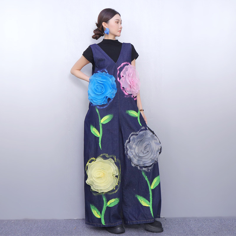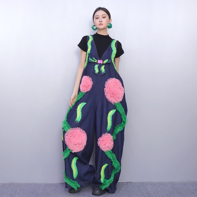 2025秋冬新款女牛仔连体裤立体花朵印花背带裤时尚显瘦宽松遮肉