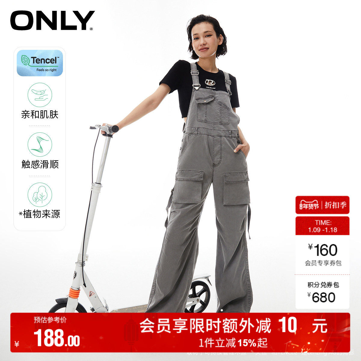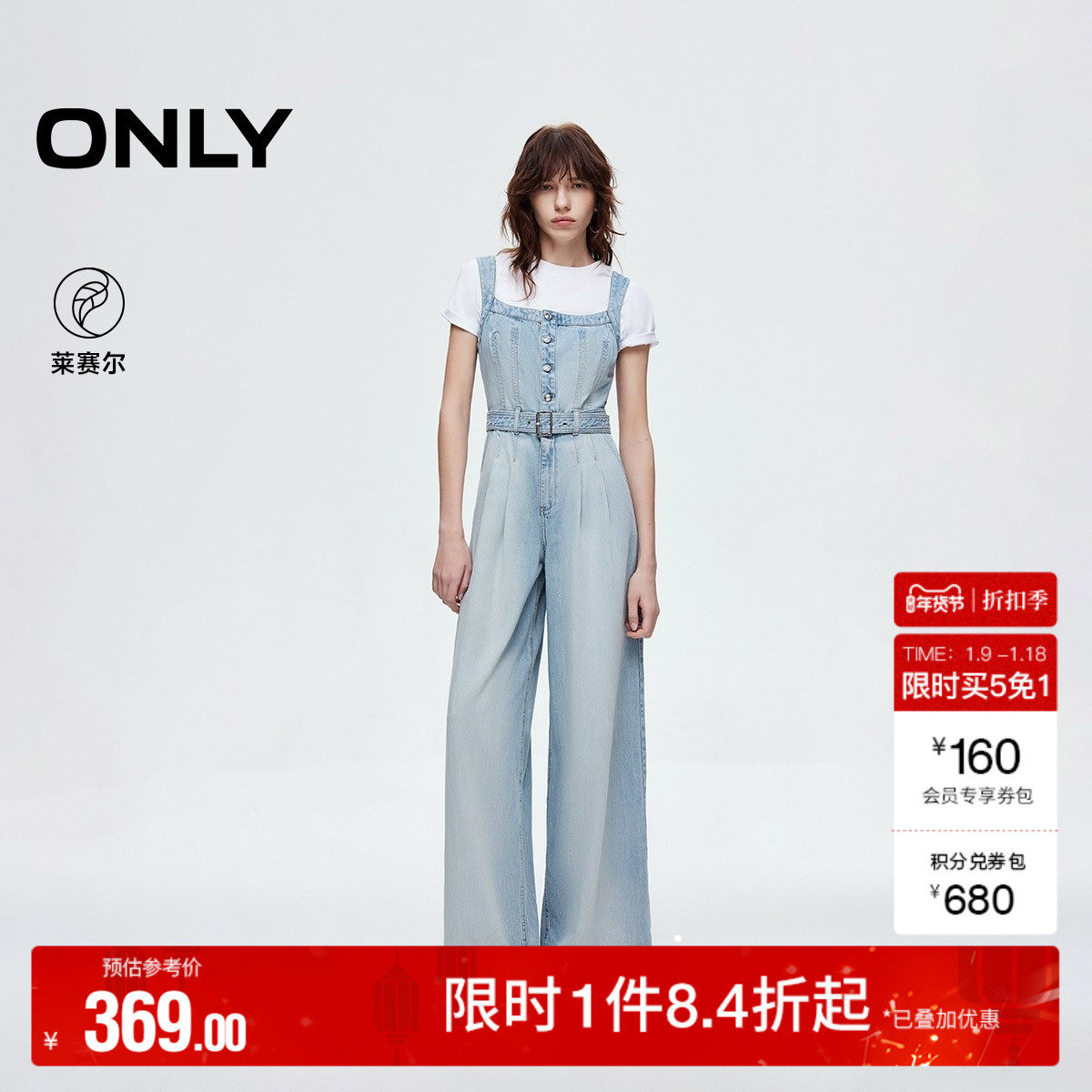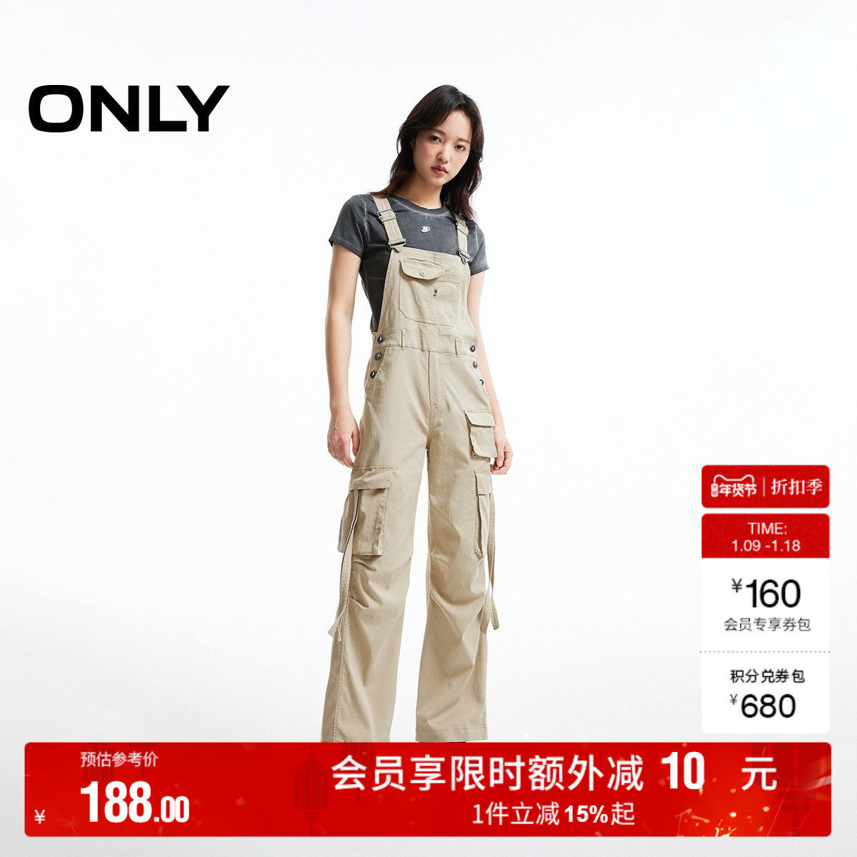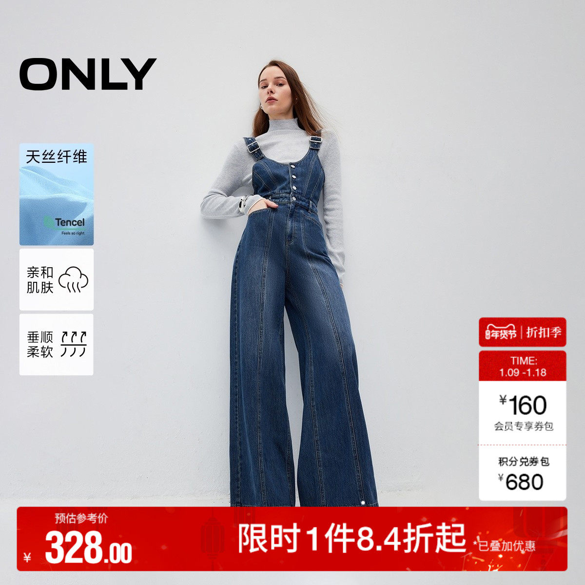 ONLY奥莱2025秋冬新款做旧水洗宽松显瘦阔腿裤长裤背带裤牛仔裤女