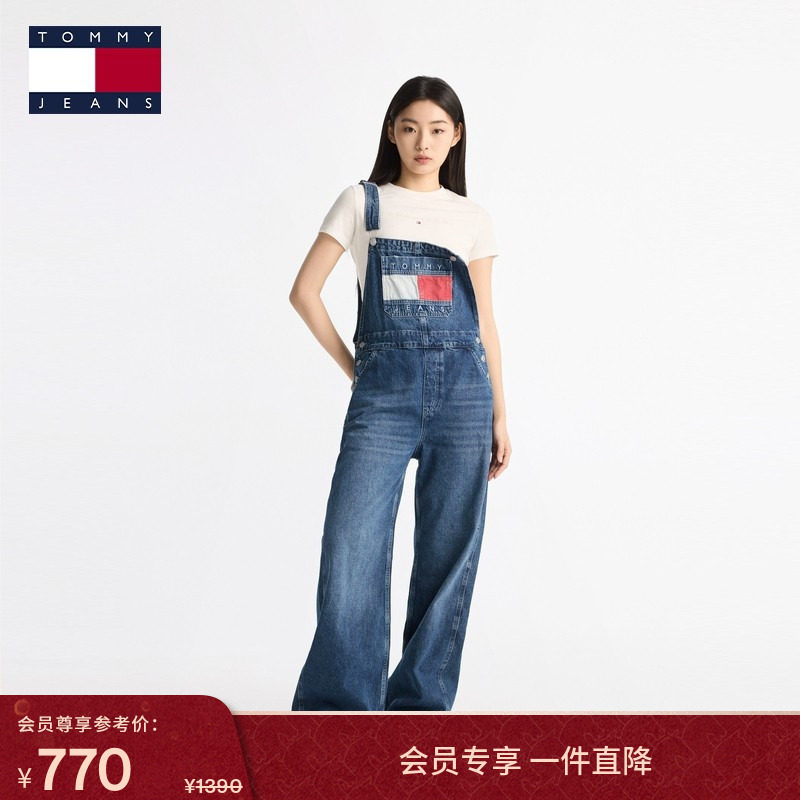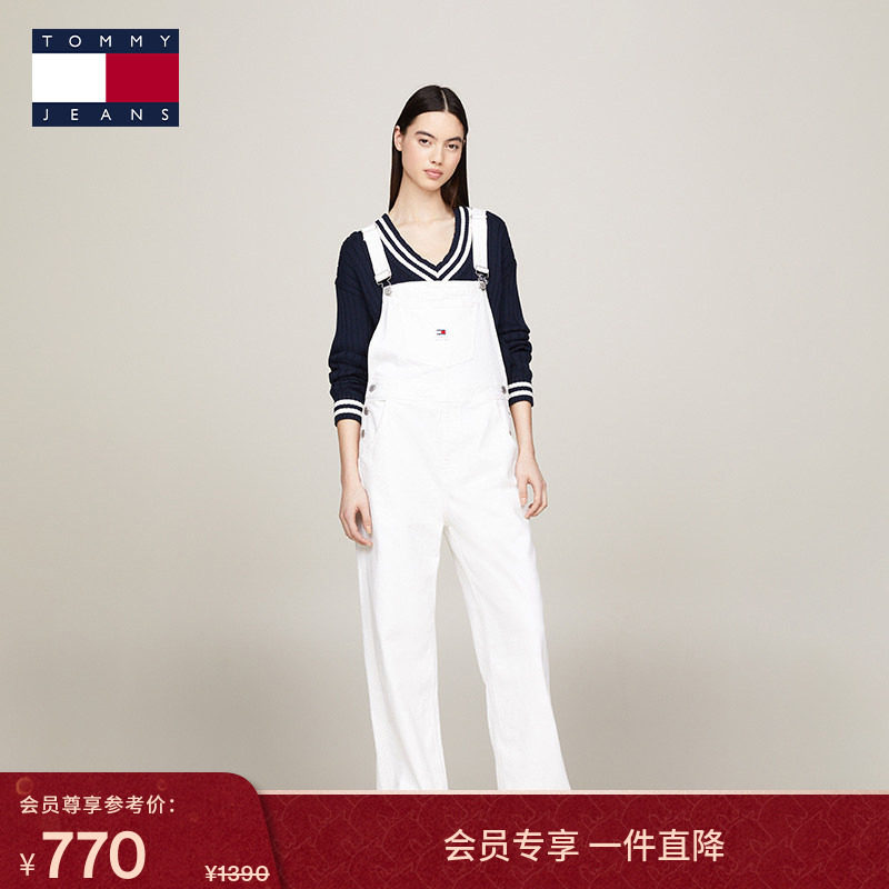 Tommy秋冬女装美式潮流复古大口袋松弛宽松阔腿白色牛仔背带裤