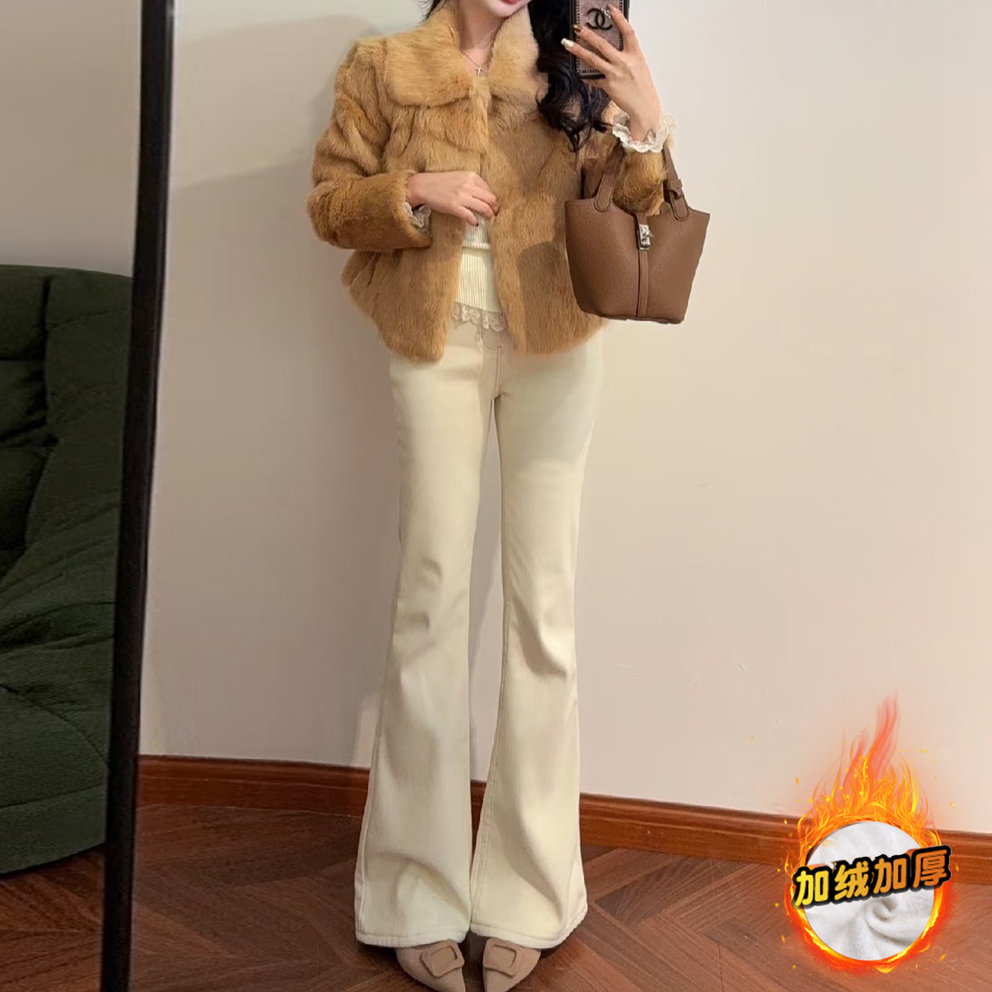 加绒米白色微喇牛仔裤女2025秋冬新款高腰显瘦气质修身弹力喇叭裤