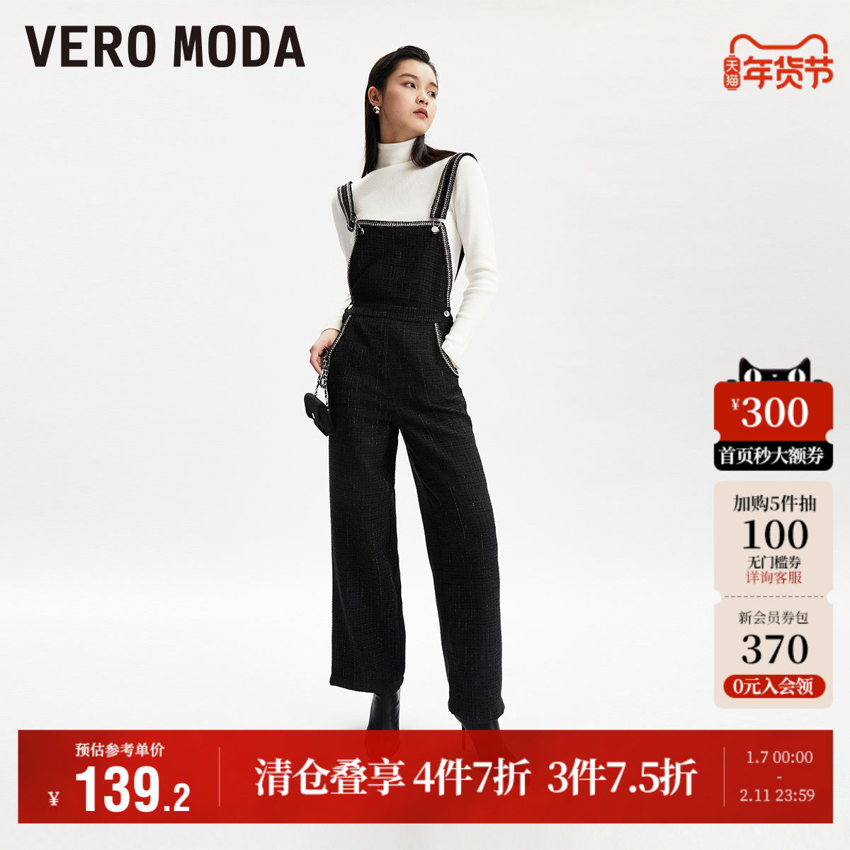 Vero Moda奥莱背带裤女秋冬清仓优雅气质通勤粗花呢直筒长裤百搭