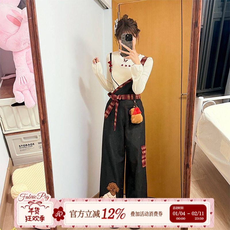 织物猪 覆盆子莓果 甜酷风复古小狗休闲裤子女秋冬红格背带长裤