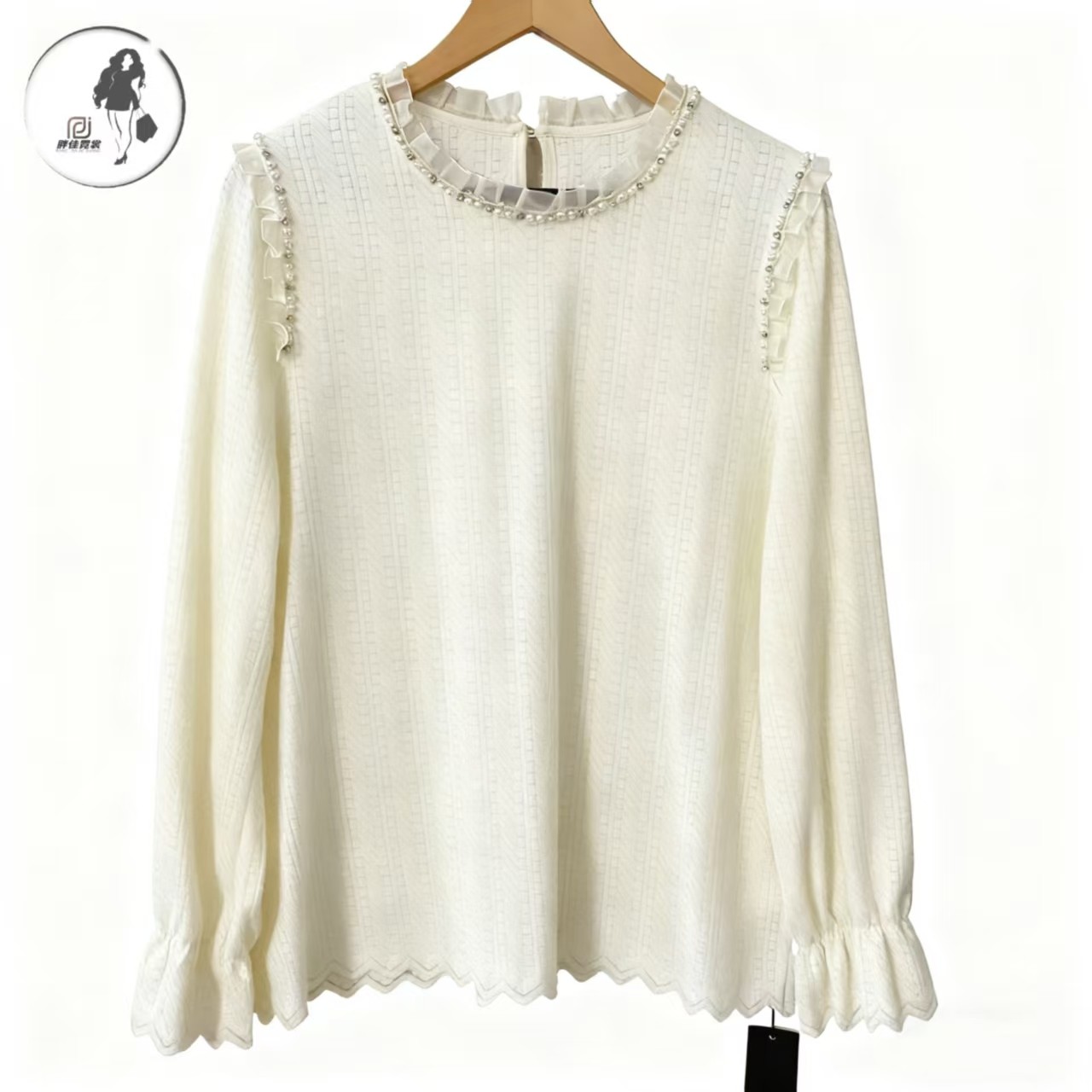 1948淑女风立领木耳边重工珍珠打底衫大码品牌女装气质通勤上衣