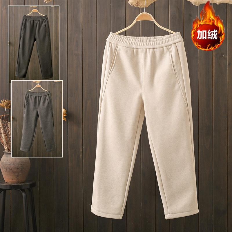 秋冬大码200斤杏色烟管加绒裤女加厚松紧腰显瘦哈伦直筒休闲裤潮