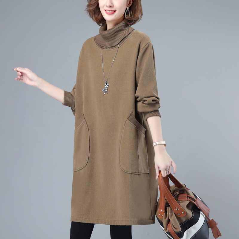 高领卫衣女2024秋冬新款宽松妈妈中长款遮屁股加厚加绒打底连衣裙