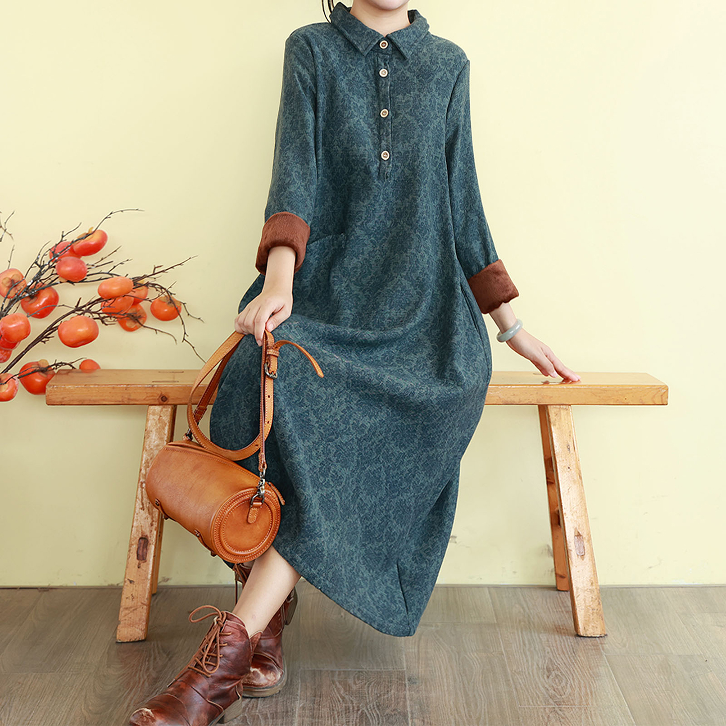 复古文艺连衣裙女秋冬季加绒长袖宽松显瘦长裙子气质过膝衬衫打底