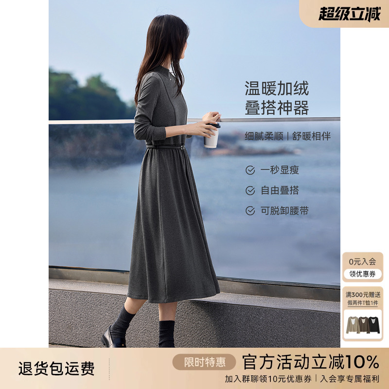 XWI欣未通勤百搭半高领加绒打底连衣裙女冬季遮胯显瘦内搭叠穿裙