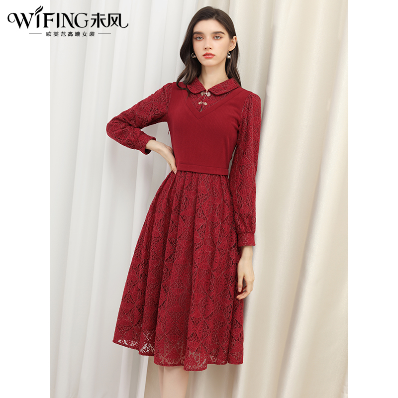 未风红色蕾丝连衣裙女加绒加厚冬季新款打底内搭裙新年战袍针织裙