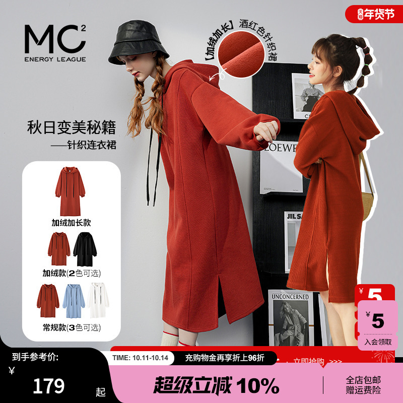 mc2加绒长款连帽卫衣裙女2024冬过膝酒红色针织连衣裙时尚打底裙