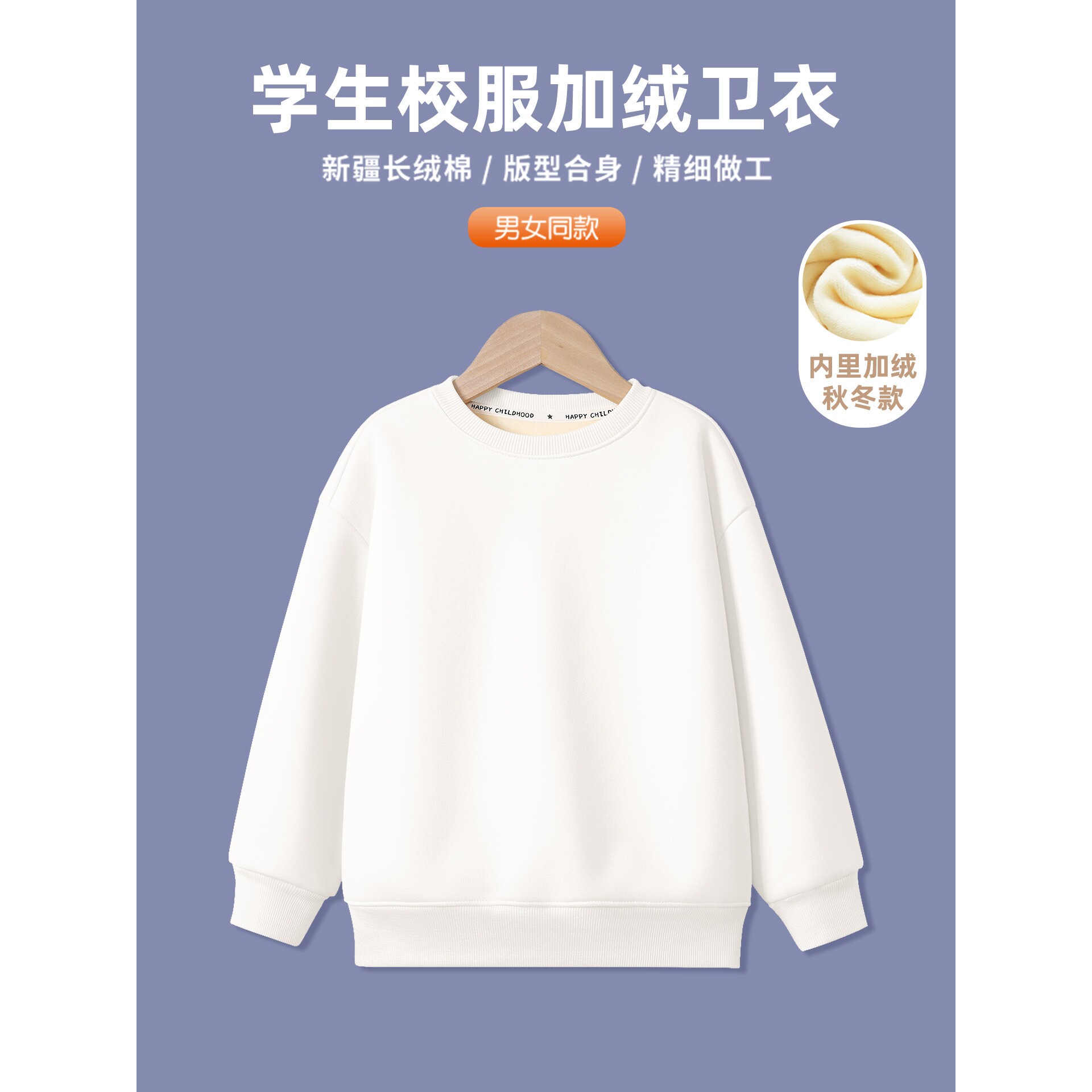 儿童加绒卫衣男女童白色上衣纯色打底衫秋冬小学生校服一体绒长袖