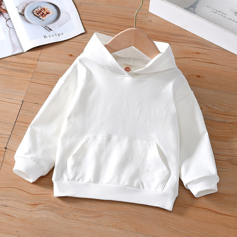 女童秋装长袖白色连帽卫衣春秋装新款中大男童装纯色兜袋落肩上衣