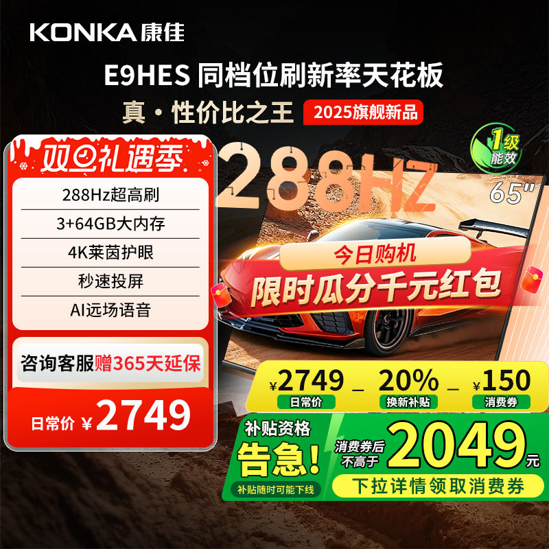 康佳E9HES 65英寸288Hz智能家用液晶电视机以旧换新补贴