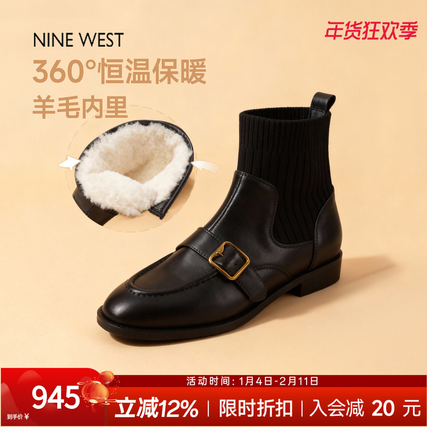 Nine West/玖熙冬季清仓款时装靴女摩登扣带圆头中跟绒里百搭中靴