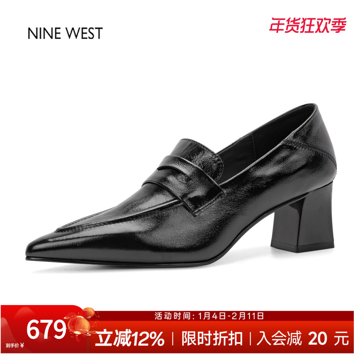 奥莱专供Nine West/玖熙复古深口乐福鞋不累脚皮鞋高跟新款单鞋女