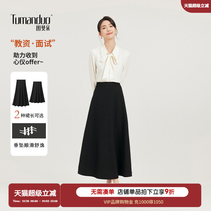 图曼朵黑色a字半身裙女秋正装教资面试职业半裙套装伞裙西装裙子