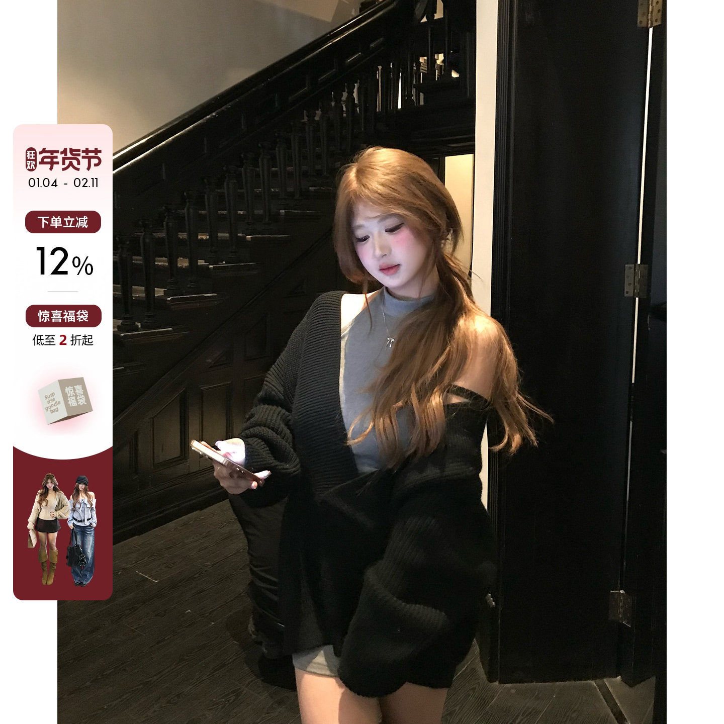 你的鱼 钓系妲己 韩系微胖mm性感V领宽松毛衣无袖修身连衣裙套装