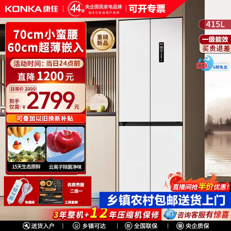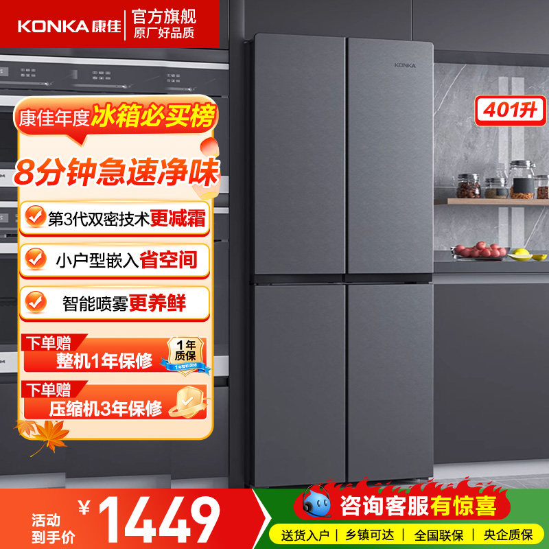 康佳冰箱家用小型400L双开门大容量双门正品超薄款嵌入式节能省电