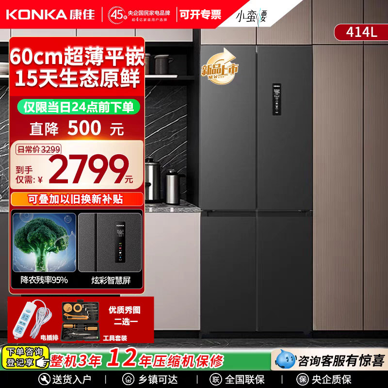 康佳414升十字四门超薄零嵌底部散热一级能效变频风冷无霜电冰箱