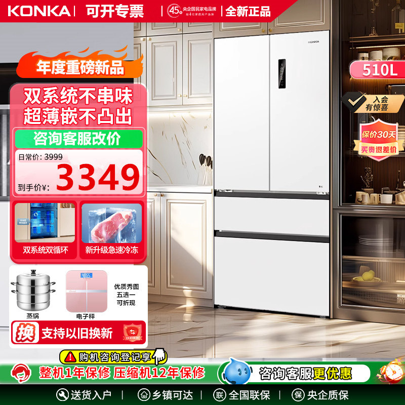 康佳510升法式超薄零嵌底部散热双系统一级能效变频风冷无霜冰箱