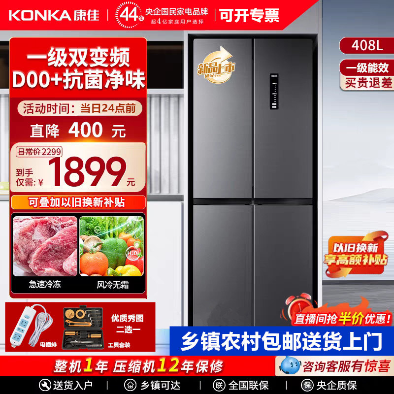 康佳408升十字对开四门超薄嵌入一级能效变频风冷无霜净味电冰箱