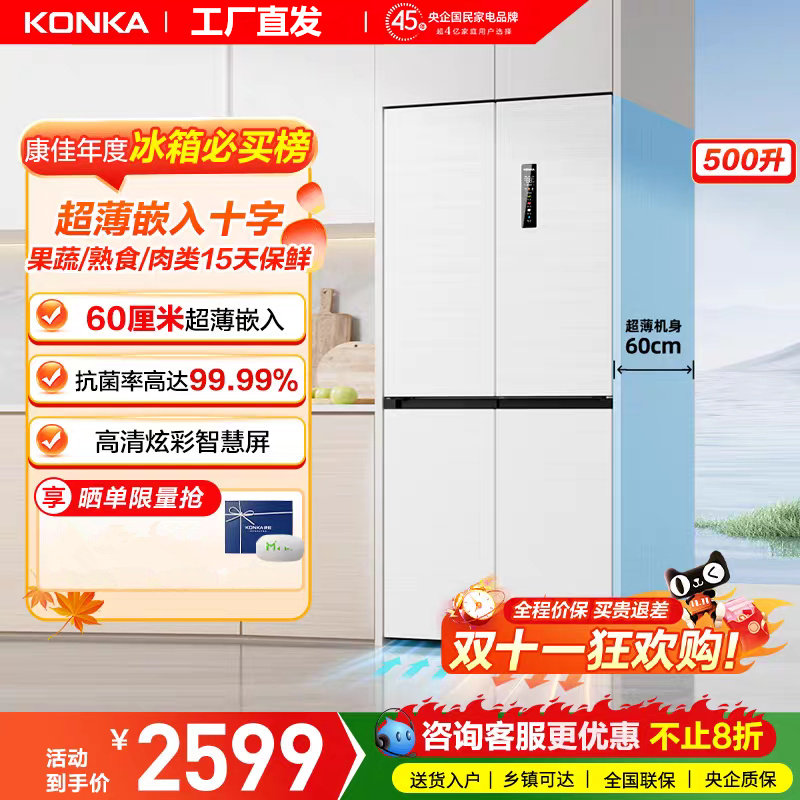 康佳500升十字四门超薄零嵌底部散热一级能效变频风冷无霜电冰箱