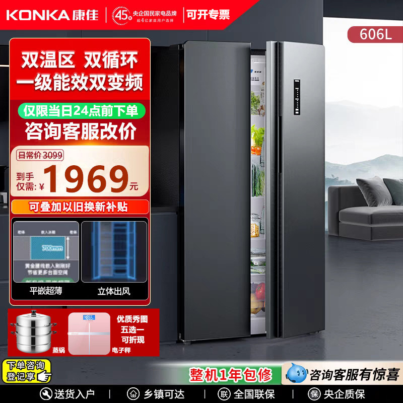 康佳606升对开双门变频双循环风冷无霜8分钟净味超薄大容量电冰箱