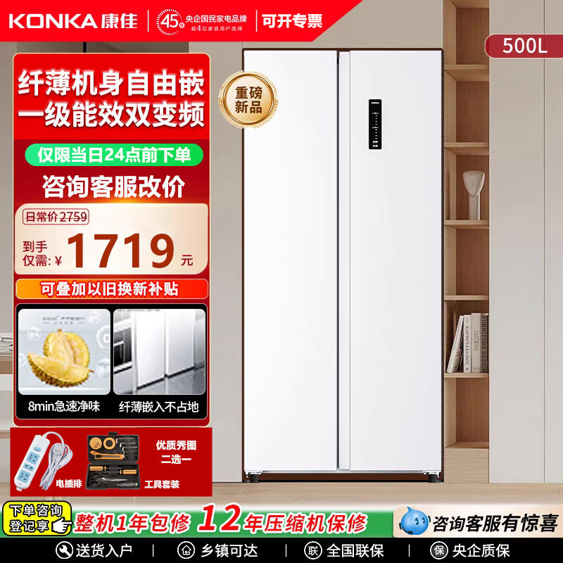 康佳双开门电冰箱白色一级变频家用对开门风冷无霜超薄嵌入式500L
