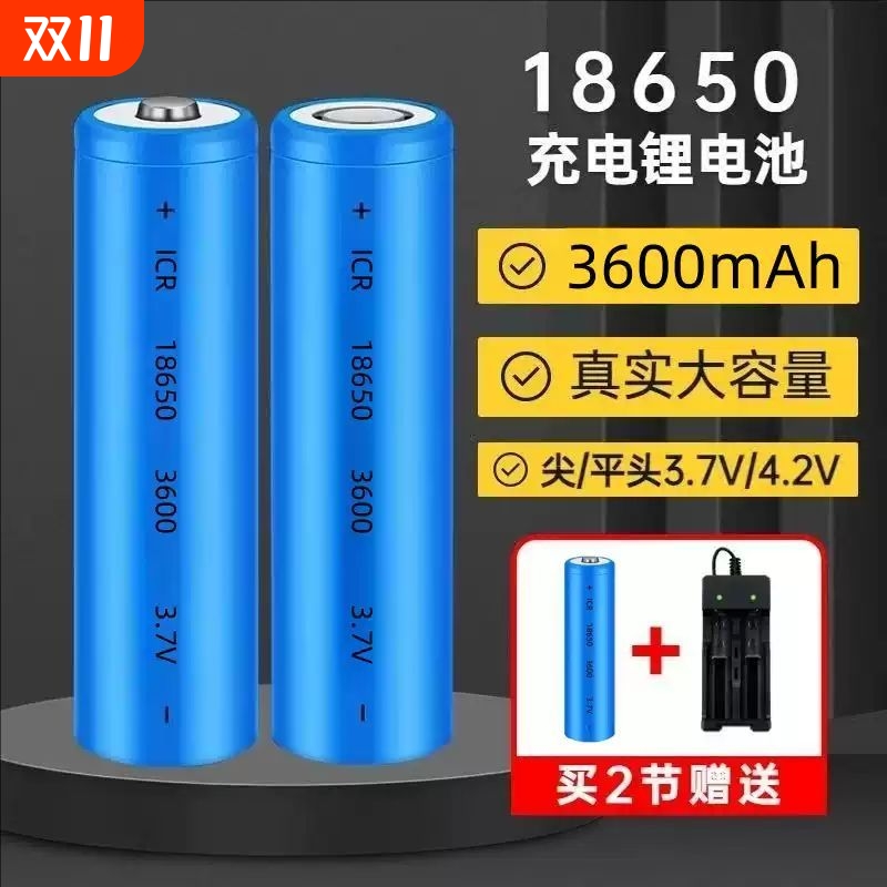 18650锂电池大容量3.7v强光手电筒小风扇平头可充电池充电器通用