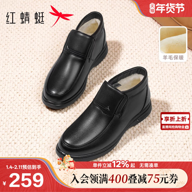 红蜻蜓男士皮鞋冬季新款加绒保暖休闲男鞋真皮中老年棉鞋爸爸鞋子