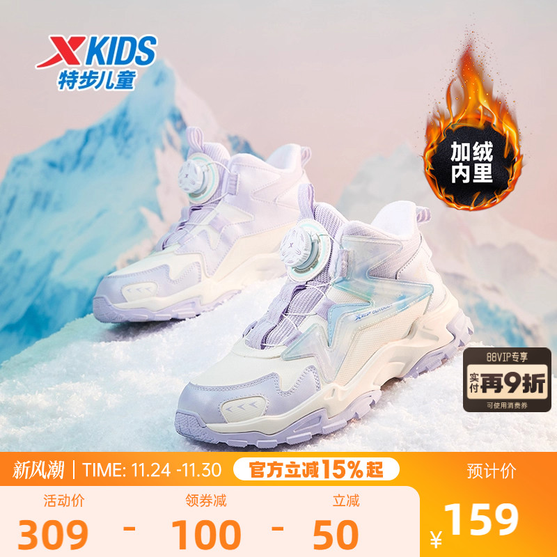 特步女童2025新款冬季加绒保暖二棉棉鞋儿童防滑皮面高帮运动鞋子