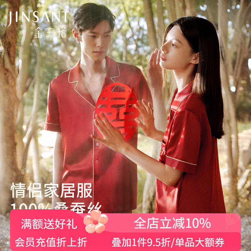 金三塔22姆米重磅真丝睡衣情侣宽松舒适短袖裤衣裤套红色婚庆礼物