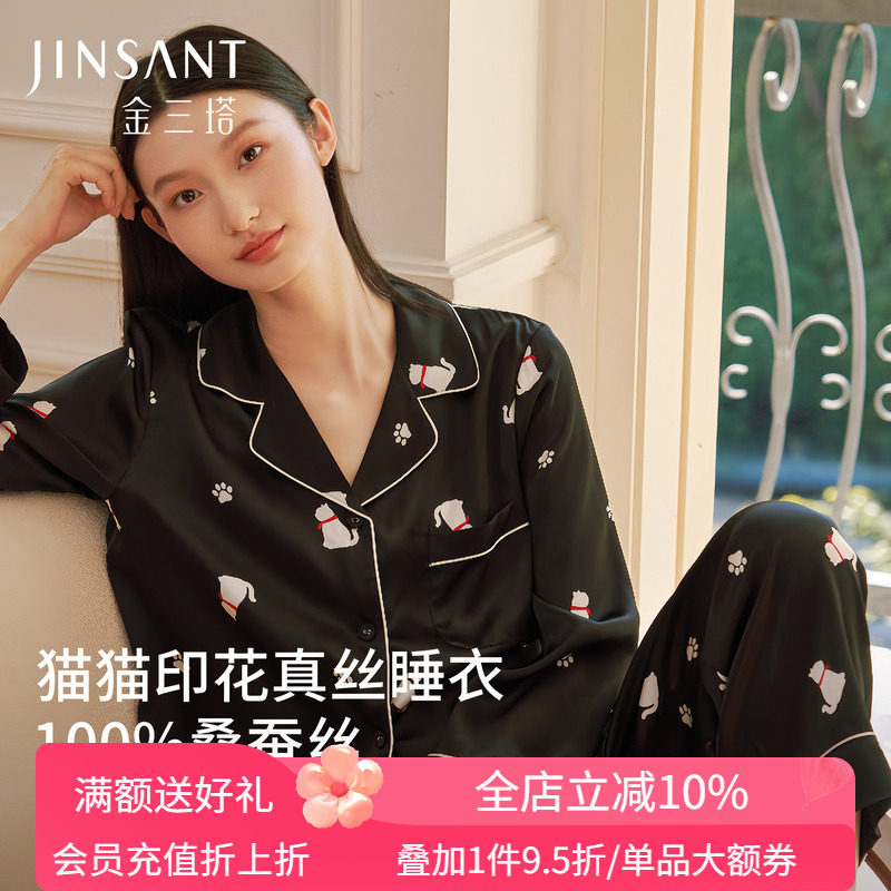 金三塔真丝睡衣女猫咪刺绣19姆米重磅100%桑蚕丝丝滑舒适家居服套
