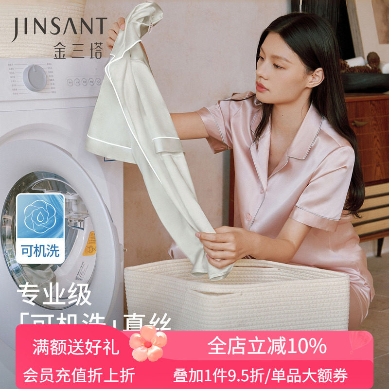 金三塔可机洗真丝睡衣女夏19姆米重磅100%桑蚕丝短袖长裤家居服套