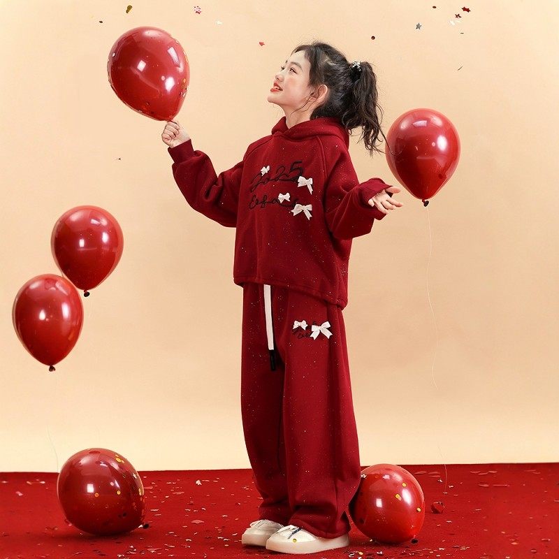 法国BADNUT女童加绒套装过年衣服秋冬运动卫衣两件套儿童拜年服红