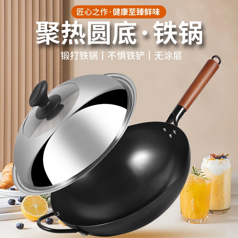 饭店厨师专用铁锅老式家用炒锅煤气灶炒菜锅不粘锅无涂层圆底轻便