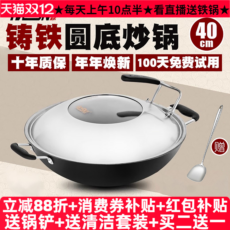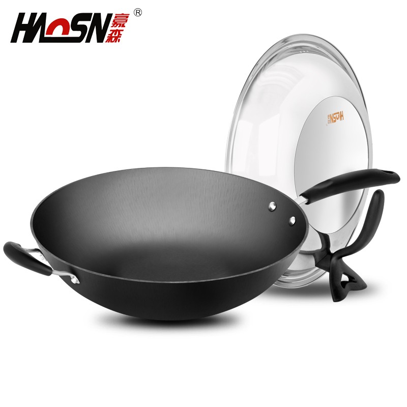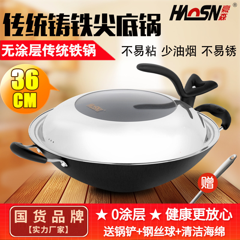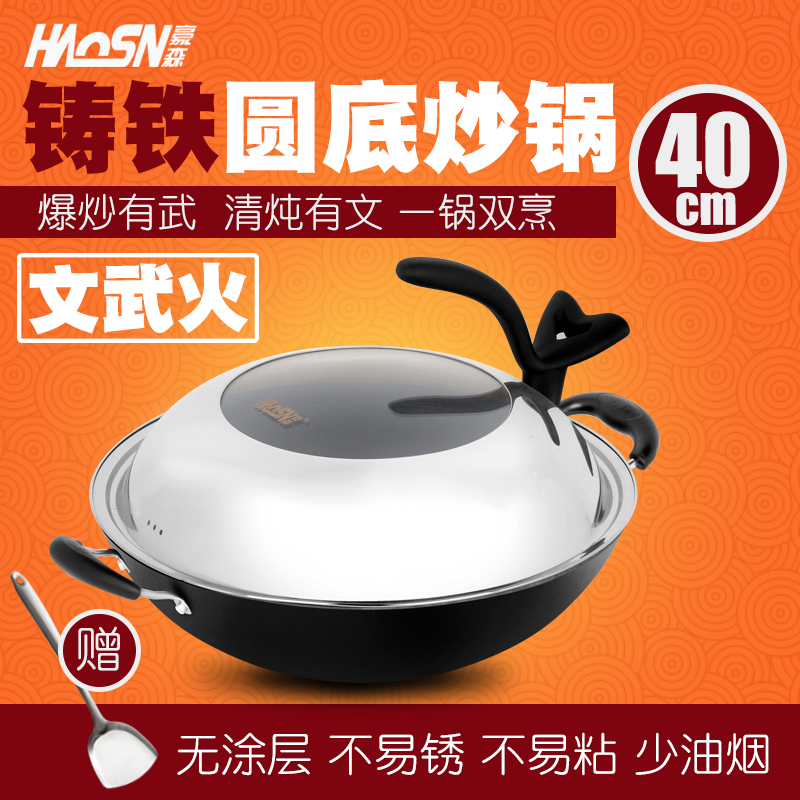 豪森铸铁锅圆底炒锅 燃气灶适用36cm手工生铁大铁锅炒菜锅不粘锅
