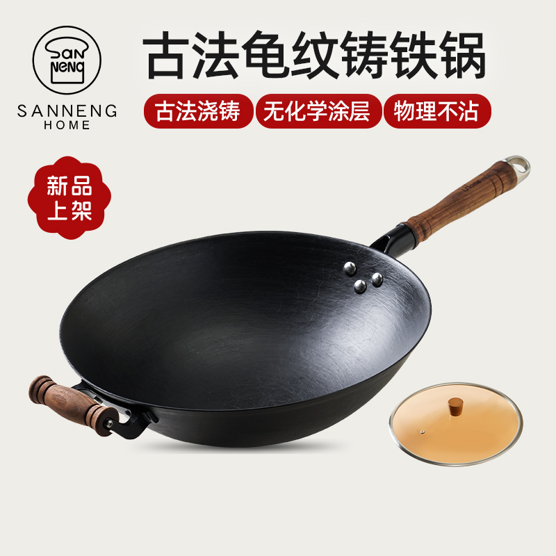 传统老式生铁锅圆底铸铁木柄炒菜锅不粘锅无涂层家用电磁炉燃气灶